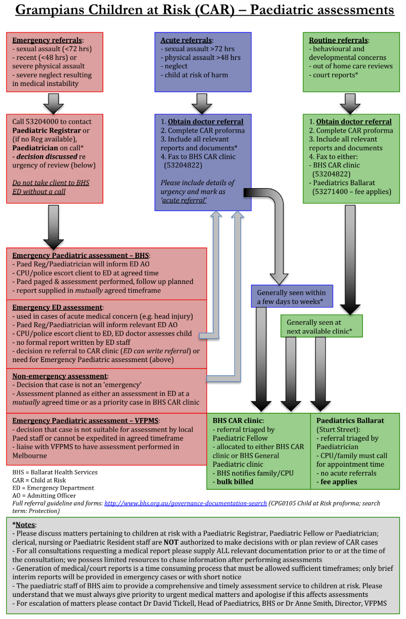 The Paediatric service at Ballarat base hospital provides a comprehensive service for children at risk. The services include acute clinical assessments, forensic assessment and ongoing outpatient followup.